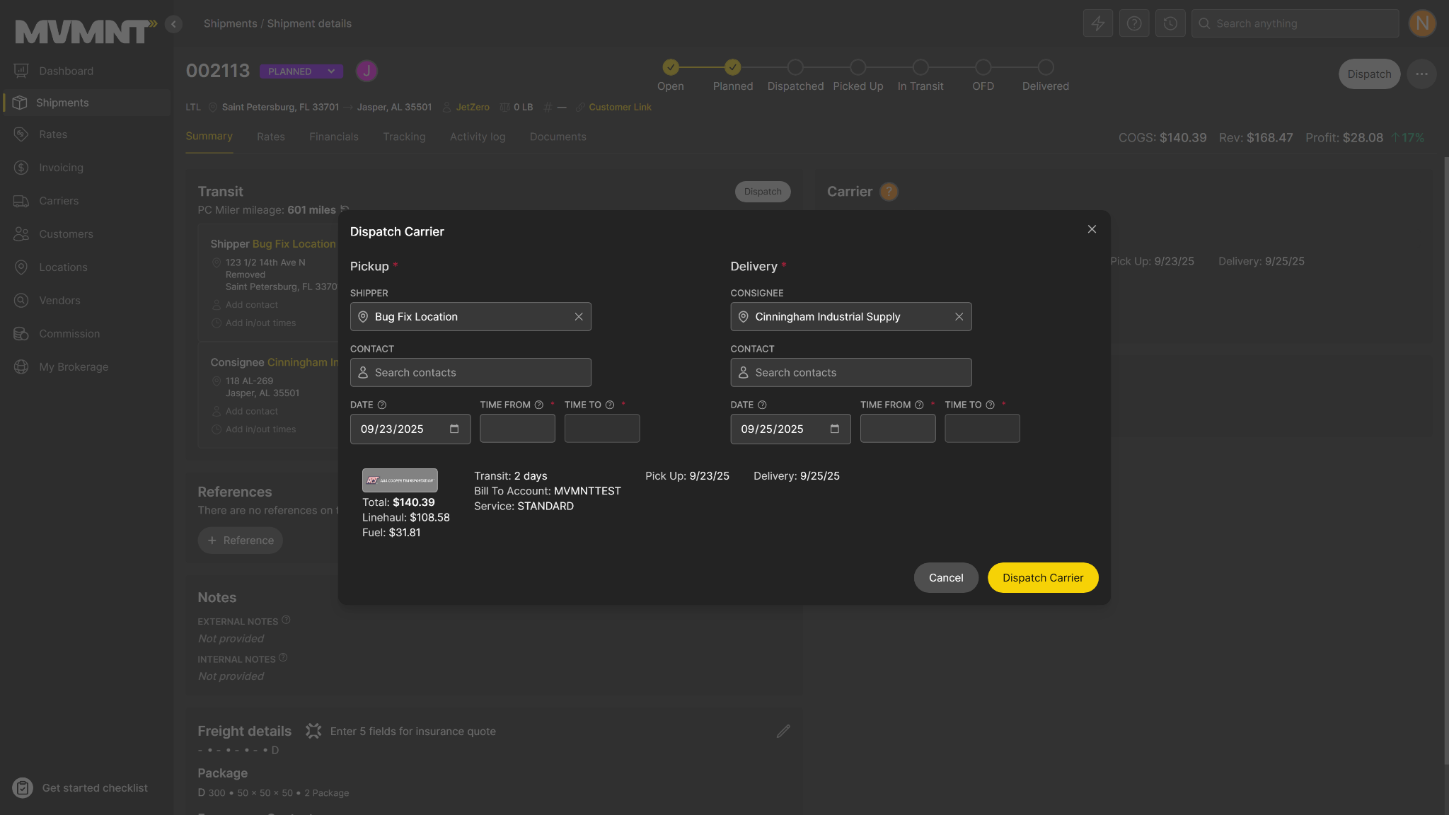 -Fill in the necessary information and then select the “dispatch carrier” option