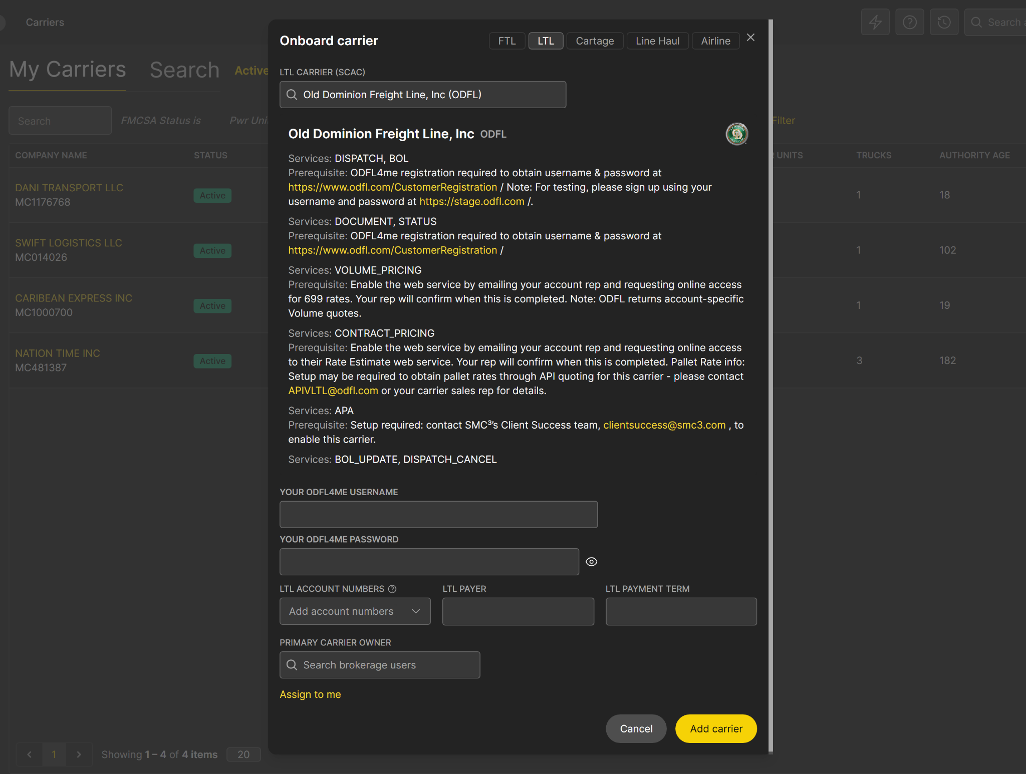 -Once selected, input the required credentials and connect the TMS to your carrier