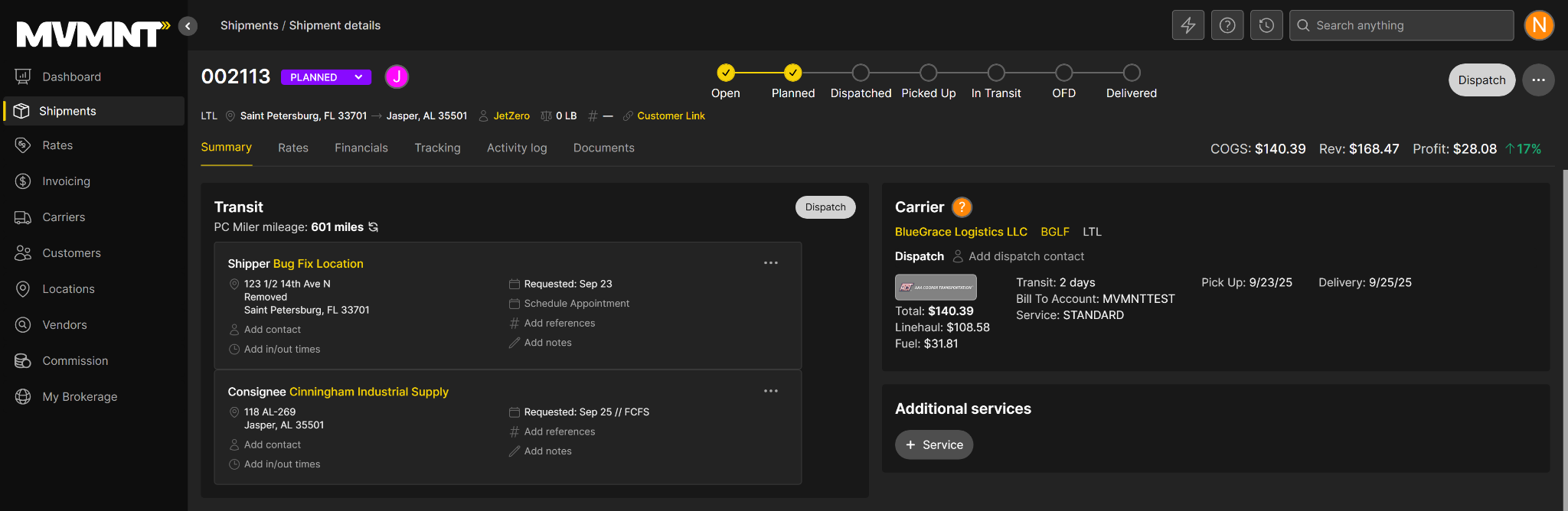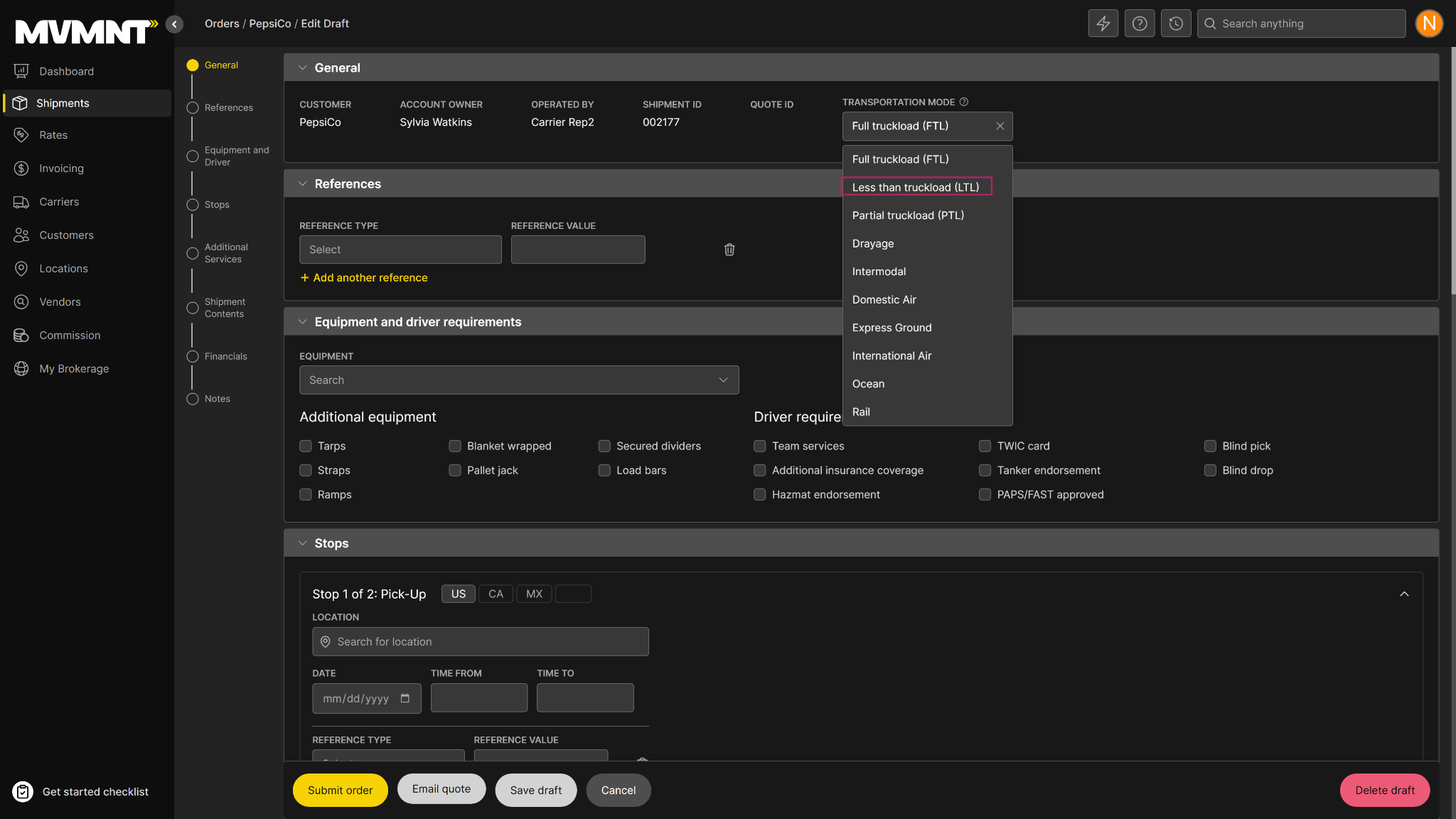 -This will change the fields on the draft shipment to reflect the new LTL mode