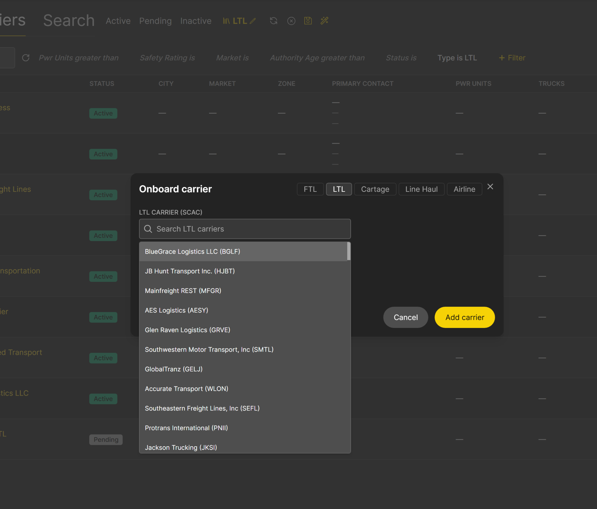-Choose from the listed carriers or start typing to find the one you want to onboard