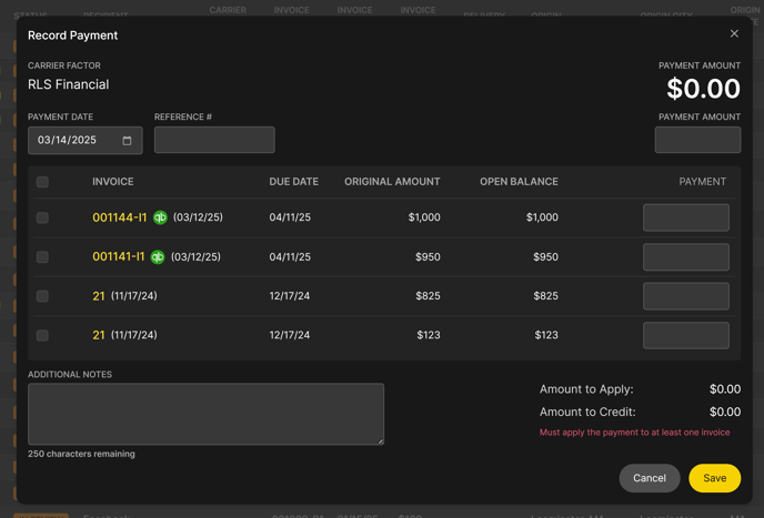 - Once you select the factoring company, you can choose which payments to apply from MVMNT, regardless if they are a different carrier.